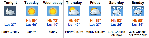 Our local NBC affiliate says this about the weekend: “The weekend may turn colder than our current forecast. Please check back often for forecast updates throughout the week.”