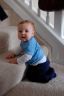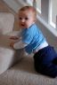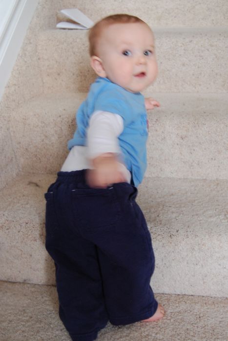 The learning continues. As mentioned earlier, Ezra is learning how to stand up, and is taking every opportunity to attempt to do so. His two favorite training sites are the bottom of the stairs and in his co-sleeper. He is also finding chances on the coffee table at home and at the day care. Here are some pictures….all done on his own.