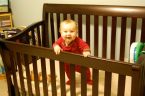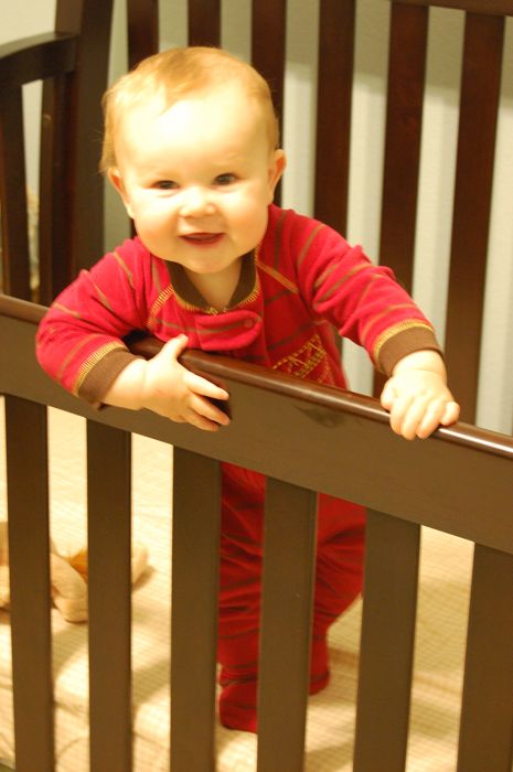 So I spent some time learning/figuring out how to lower the mattress in the crib to prevent him from being able to fall out….but within minutes of completing the task, we learned that it wasn’t going to work to our expectations. Upon being placed into the crib, he immediately stood up, and the new height only served as a better stability platform for him. ~sigh~ I suppose that it’s time to come to grips with the fact that there is a possibility that he could get out if he wants. I still think it’s a little while away, but the absolute safety of placing him somewhere with little concern seems to be gone. At this point, it appears that crawling has turned into a tool for him to move between places to stand.