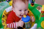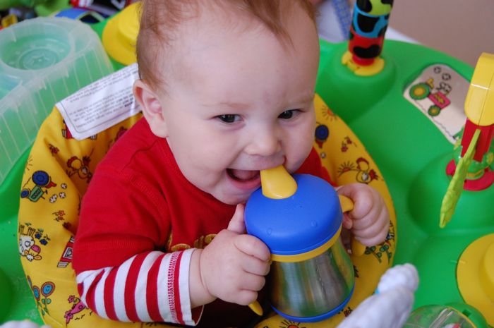 So today we will participate in the celebration of Ezra’s first Valentine’s Day by going out to brunch with our ‘family dinner’ gang, then later heading out to dinner as just the three of us. Ezra got a head start on the partying at his day care on Thursday, as Peggy hosted a Valentine’s Day party for all of the kids. It sounds like it was a good time….for the other kids…..Ezra apparently slept through most of it. He did write everyone a Valentine’s card, and gave everyone a little piece of candy. Of course, he came home with a little brown bag full of cards and candy from the other kids. It’s a shame that he can’t eat that stuff yet, and someone will have to pick up the slack. Also, Peggy gave him a little gift of a sippy cup – which transitions well to the next paragraph.