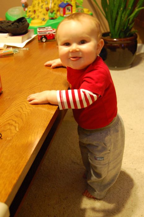 Yup, that’s him standing on his own on the table. He has gotten really good at sitting on his knees and picking himself up to a standing position on nearly anything. He also is loving climbing stairs, and can do two or three on his own before forgetting what he was doing.