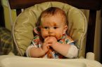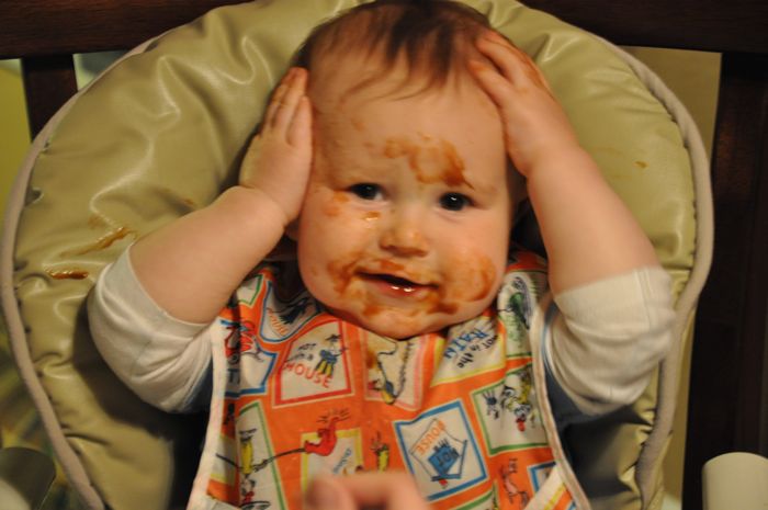 So as Ezra has gotten more and more interactive, there have been some consequences that we have been surprised to find. In the past, Ezra has been a really good and patient eater when chowing on solid foods….but recently, he has started to play with us more, and has been enjoying playing peak-a-boo; which he does by putting his hands on top of his head. Combine the effort to play with the effort to eat – especially the extra sticky food: prunes – and you get a big ol’ mess…and a good ol’ time.