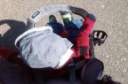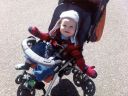 Two photos are via the camera phone during a walk that Ezra and I did last week around the neighborhood. One of them is from the perspective of someone pushing Ezra, to show you how he loves to ride around lounging with his foot up. I knew that as soon as I walked around the stroller he would take it down, thus the angle. I would suggest that he rides with one or both feet up like that 80% of the time or more. It’s hilarious.