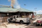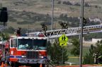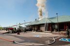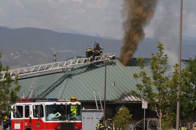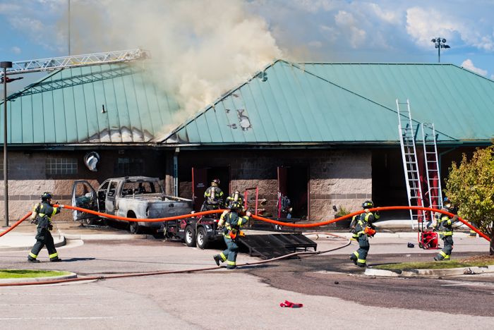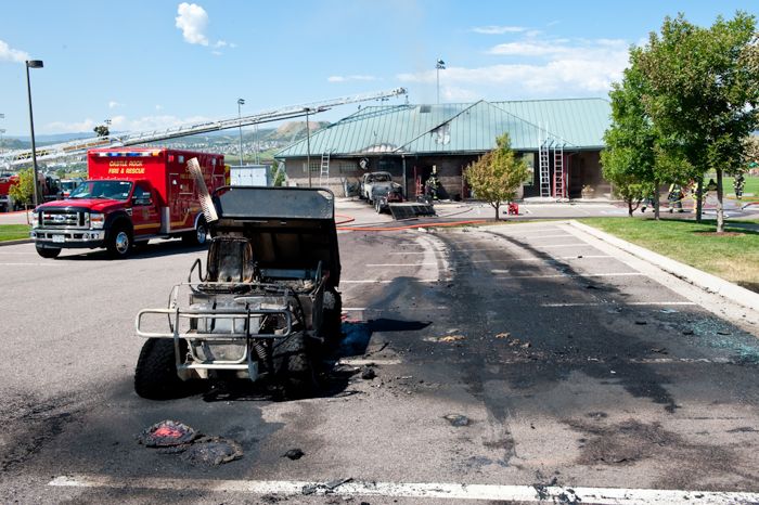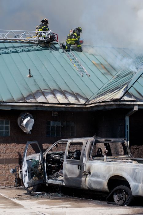 Secondly, here are some pictures from a fire that we had at work on Thursday afternoon. Super crazy story as to how it happened….a Park/Rec employee was filling a golf cart with fuel when static buildup from the filling process caused a fire. His shirt caught on fire, he ran. The fire then spread to the golf cart, and to the pickup (which was about 50 feet from the building). As the worker ran away, the fire burned through the brake lines in the truck, and the truck rolled down the hill and into the building. When it hit the building, it ran into the gas meter and that started some small explosions….catching the building on fire. Wew.