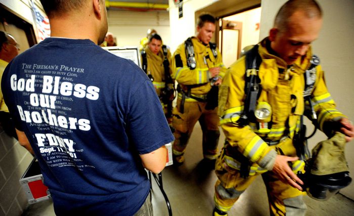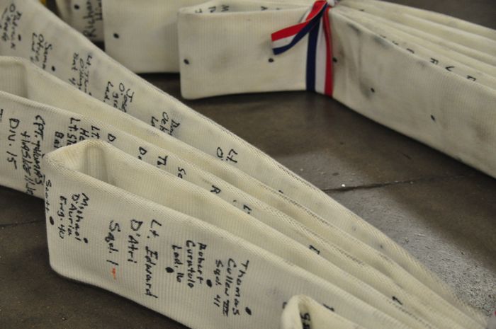 There are no pictures of me climbing…but there are several during the event (I am wearing the t-shirt that says “God Bless The Brothers From FDNY”). Photos were taken by my Dad and a photographer from the Boulder Daily Camera. In one of the photos you will see a piece of hose with names written on it. There was a firefighter from Arizona who came up and on that hose is the name of all 343 firefighters killed. Oh, there is also a nice video attached.