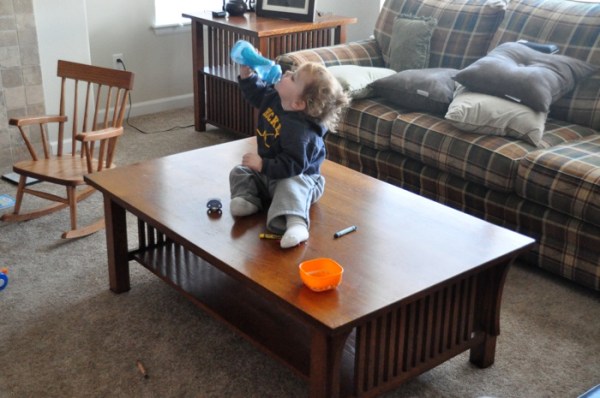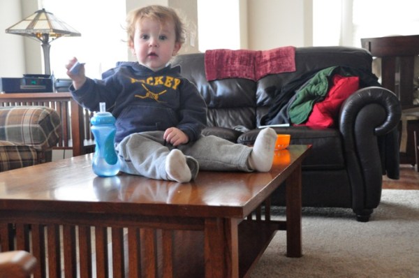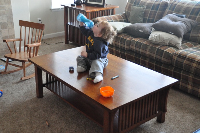 Parent not paying super close attention + an explorative child + the right age + the right flexibility + lots of grunting = a new hobby. Seriously, why walk around the table to get your water, when you can just crawl over it and sit down once you get there.