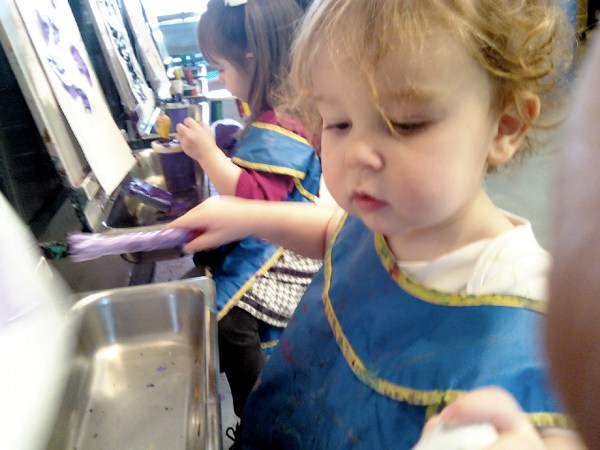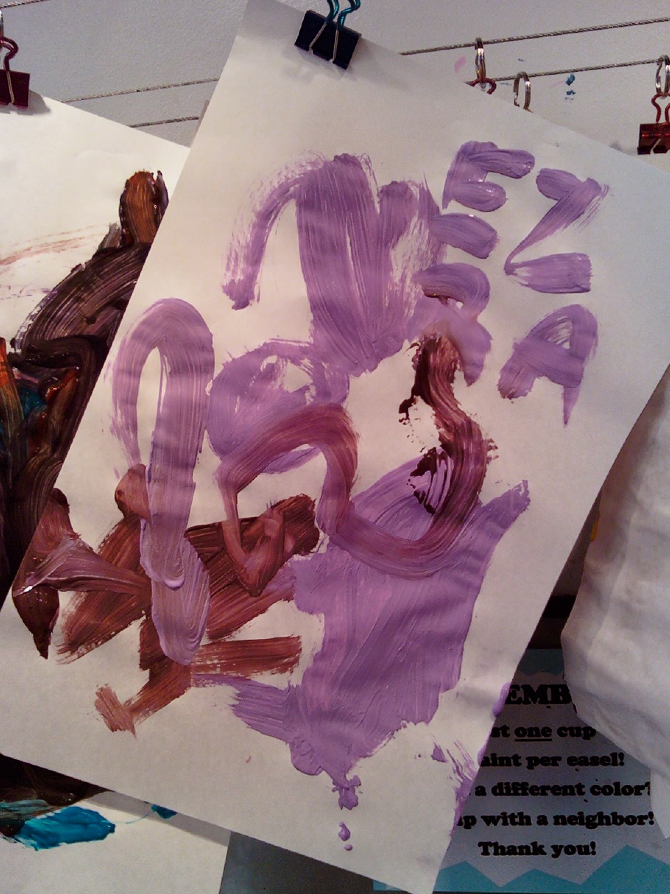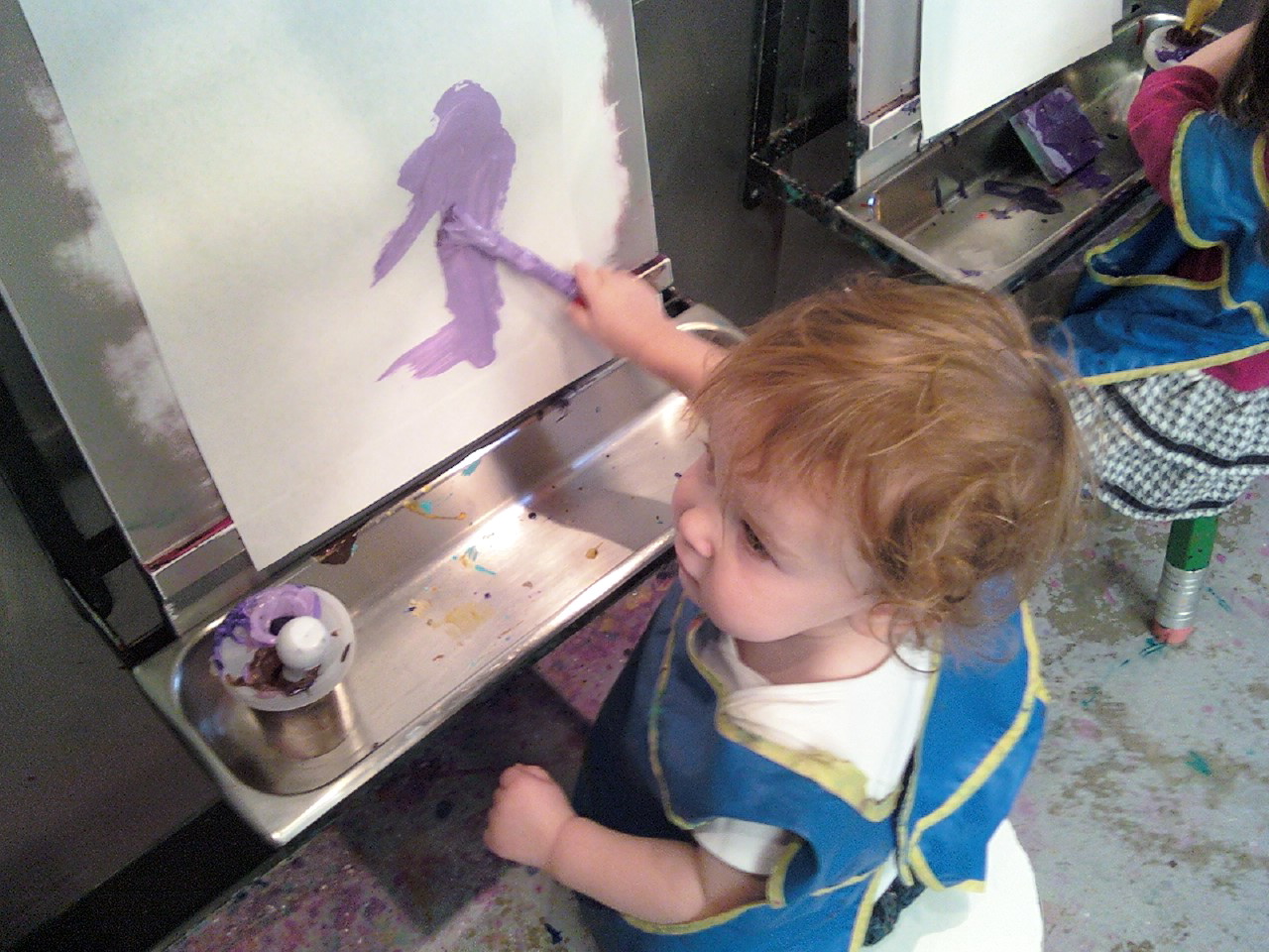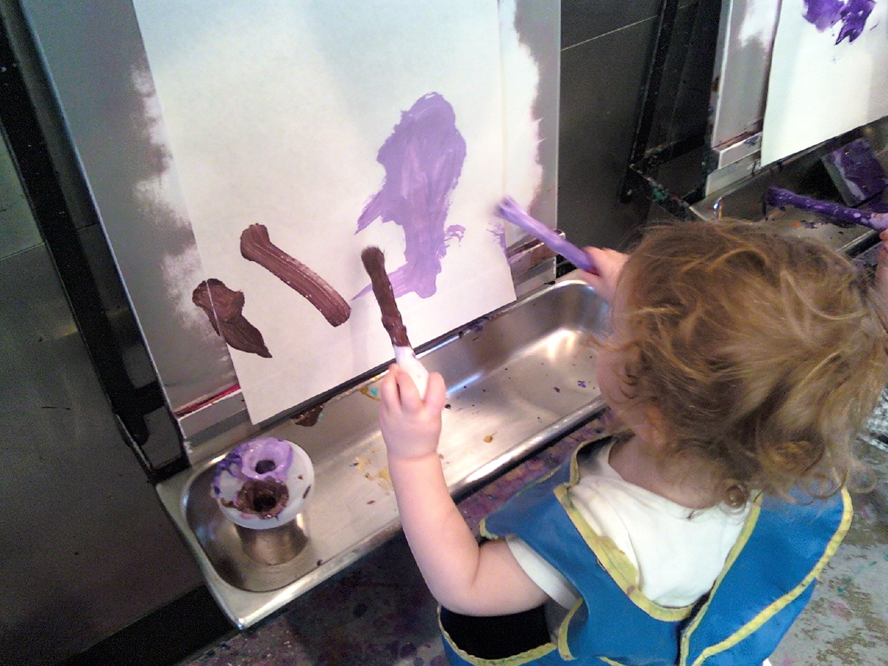 About the only part of the entire museum where we could find our own space to do anything was in the painting area. We got there and I took off Ezra’s long sleeve shirt in the hopes of a little less possible paint transfer (it was worth it). I proceeded to ask Ezra if he was ready to paint; when I actually think I was asking myself that question….moments later he was wearing an apron/bib, holding two brushes, and painting on a piece of paper. It was cool and fun, and only resulted in minor paint-on-the-hands.