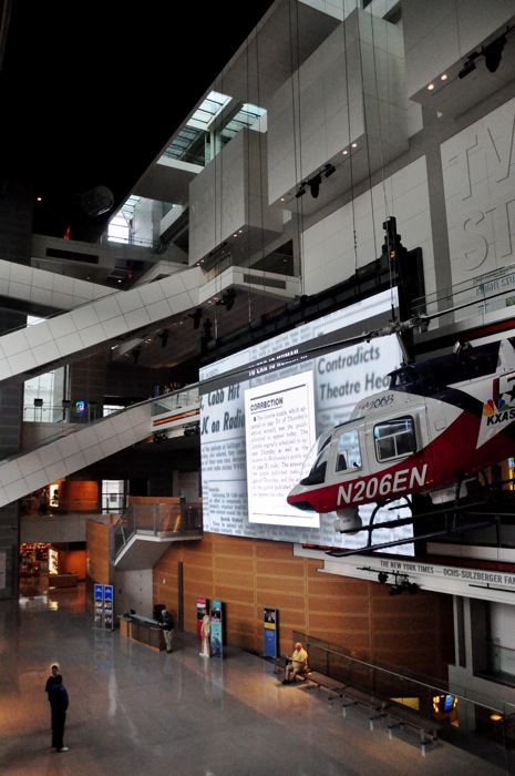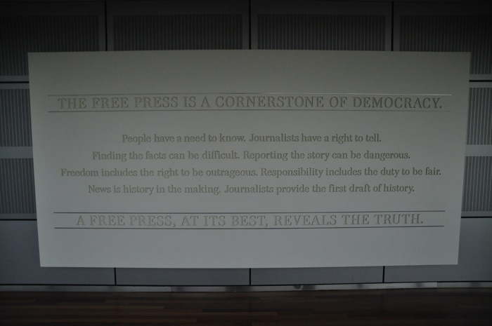 They have an amazing 9/11 exhibit of which the centerpiece is part of the TV antenna off of the north tower. They also have a great 15 minute video of interviews and footage from the NYC reporters covering the news that day. On the first floor is an exhibit of all of the Pulitzer Prize winning photos since they started giving out that award. Then all of the way in the basement of the museum, there is a piece of the Berlin Wall and one of the watchtowers from the wall. I had a good time and highly recommend this museum (full disclosure: I am a news junkie).