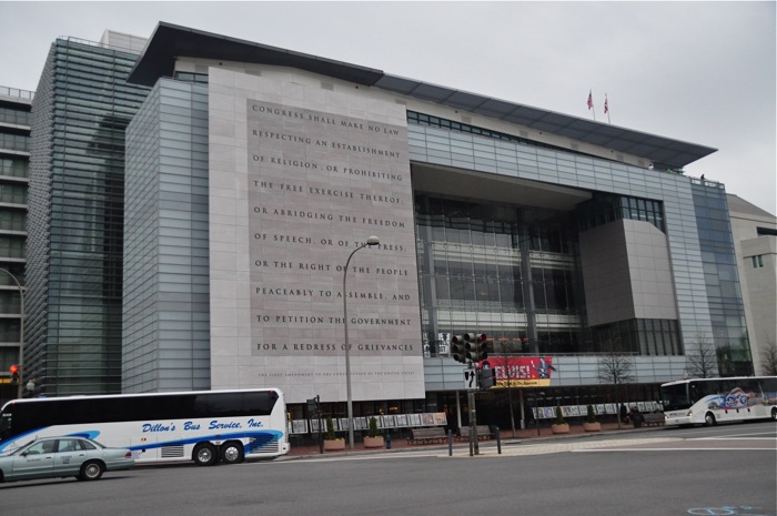 While in DC, I visited the Newseum – a place that I hadn’t been to since it was formerly located in the first two floors of the old USA Today buildings in Arlington. Since then, they built a beautiful new building only blocks from the Capitol and right next door to the Canadian embassy. It’s a fantastic museum that takes you through a lot of US history as told by and through the media. There are lots and lots of interactive exhibits and some really interesting artifacts. I would suggest that the appropriate age for this place be 7th or 8th grade on up. One of the coolest features of the place is the ‘Current Day’s Front Page’ exhibit on the 6th floor. It shows the front pages from all over the world and all 50 states from that same day (click here for an on-line version). Also on the 6th floor is a unique view of the US Capitol building that was never before seen until this terrace opened a couple of years ago.