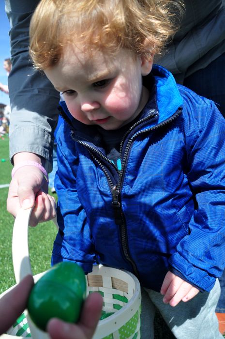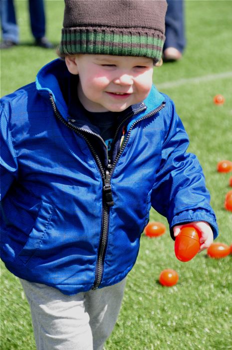 How do you spell bedlam? N-E-I-G-H-B-O-R-H-O-O-D E-G-G-H-U-N-T. I know it’s a lot of letters to sound out, but I am confident that if you read it again, you can figure out that it says ‘neighborhood egghunt’. It’s a really windy day today, and that made for a little extra craziness on top of the several hundred kids and associated parents standing on the edge of a field filled with candy. After the official ‘go’ was announced, the intent was to go out and start finding some eggs with Ezra for his basket. It turns out that Ezra had a different plan: a full-speed sprint through the crowds and across the field. Only after much chasing and people dodging, were we able to convince Ezra to pick up a few eggs and place them in the basket. Following the chase hunt we ran from the crowds and towards home and luckily for Ahna and I, Ezra doesn’t eat candy…
