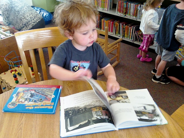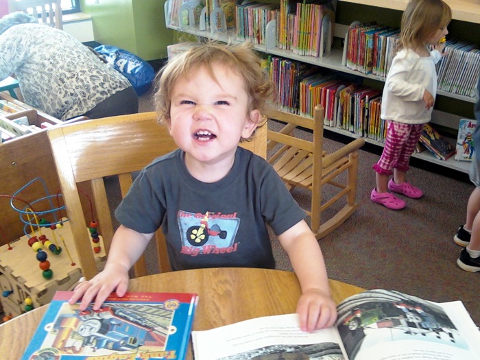 As we are experimenting with a new nap routine (more on that in another post), we took the opportunity to head over to the local library this morning for storytime. And by ‘storytime,’ I mean: chase Ezra around the kids area of the library time. He sat there for about 3 minutes – the duration of the first book that was read – then made a b-line to the other part of the kids area to find the Thomas and Friends books. After about the third time he did this, I conceded the battle and let him do what he wanted. What he wanted to do was read on his own. We sat there for about 30 minutes with Ezra getting a new book, bringing it to the table, reading it, and putting it back. It actually was more satisfying in some ways than the storytime would have been…