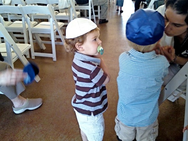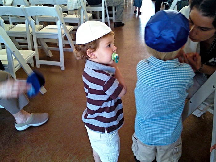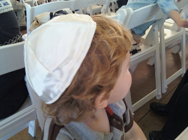 Okay, the wish is a few days late by the time I post it here (it means Happy New Year!)….but I figure that we are still in the middle of the High Holy Days and it’s appropriate. Ezra and I attended a family service for Rosh Hashana last week (the Yom Kippur service is this upcoming Saturday), and let me say this: 30 minute family services are a great invention. It was nice that the service here was a thoughtful, Rabbi-lead service….not an afterthought. It was fun to be able to participate in things that connected with Ezra, and just as importantly, to not worry when he would loudly sing along or dance in the aisles. With the help of his friend Micah, Ezra found a kippah and proudly wore it for the services.