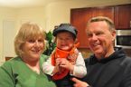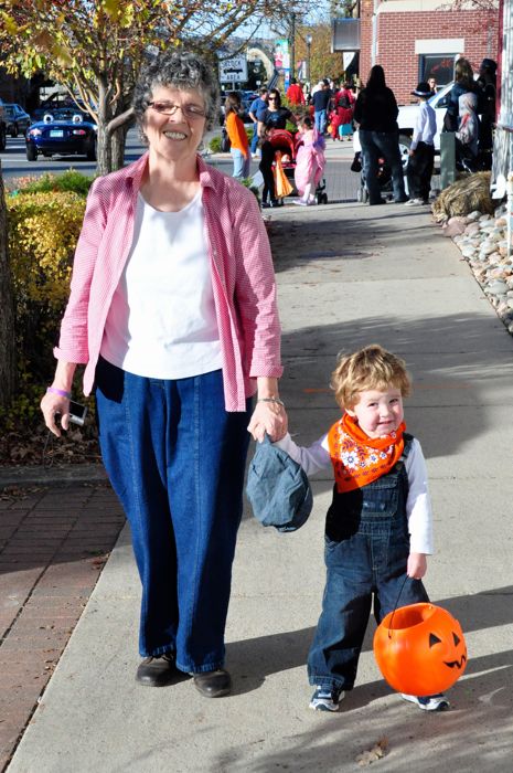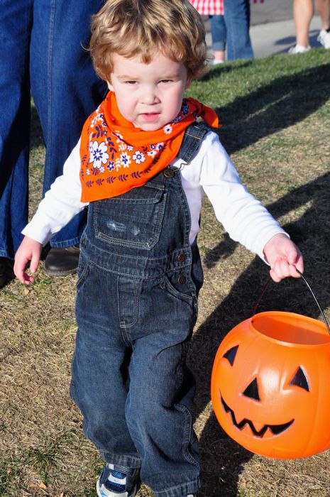The Friday evening event was so-so. The so-good part was that there was something to do downtown that was kid-oriented and family fun. The so-bad part was that there was about 10 times too many kids walking on a pretty small sidewalk from shop to shop. The so-great part was that Nana was in town to visit and Ezra got his first candy collection with her by his side. It was Ezra’s first time really seeing anyone dressed up in costume (that he can remember), so when he first saw Buzz Lightyear and Woody walking around the park, he stood in shocked disbelief for 2 minutes. I think that he was just starting to get the hang of it all by the end of our time downtown, but he still would turn and stare whenever a character that he recognized would run past.