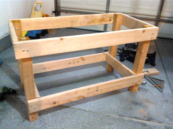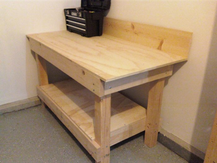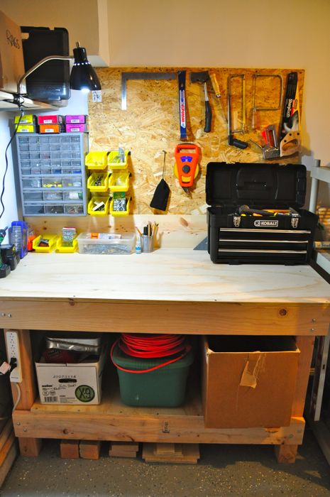 The work bench is complete! I was able to find some plans for a basic bench – after sorting through seemingly hundreds of plans for woodworking benches complete with router drawers and built in tool storage – and built it over the course of two days…probably for a total of 4 hours of work. Total project cost was just over $100.00 for a table big enough and sturdy enough for just about any project that I am looking to do – including ski tuning.