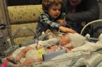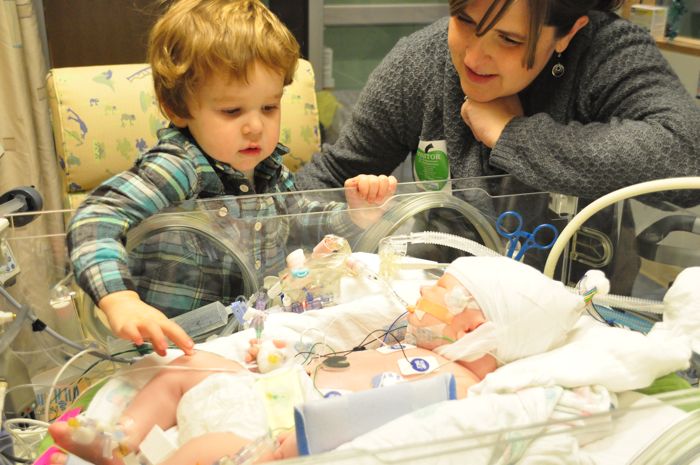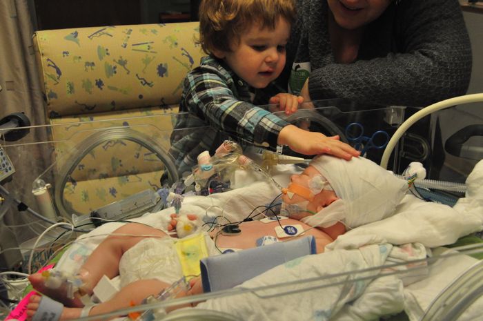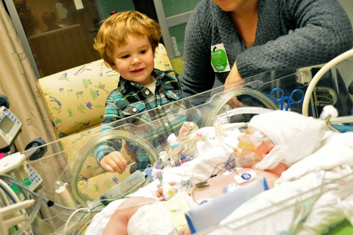 During the holiday, the rules at the visitation rules at the entire hospital – and especially the NICU – were relaxed a little to allow for families and siblings to visit (they are pretty strict this time of year due to flu/cold season). Last evening we were able to bring Ezra back into the room to meet Liam for the first time. As we eluded to in the last post, we were a little worried about how Ezra would do in the room full of things that he couldn’t do…but we were wrong. Just before coming into the NICU, I sat down with Ezra and explained that he couldn’t run and couldn’t press any buttons. His response? A remarkably understanding “Ok.”