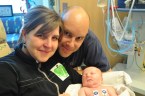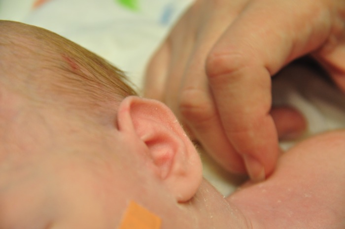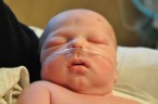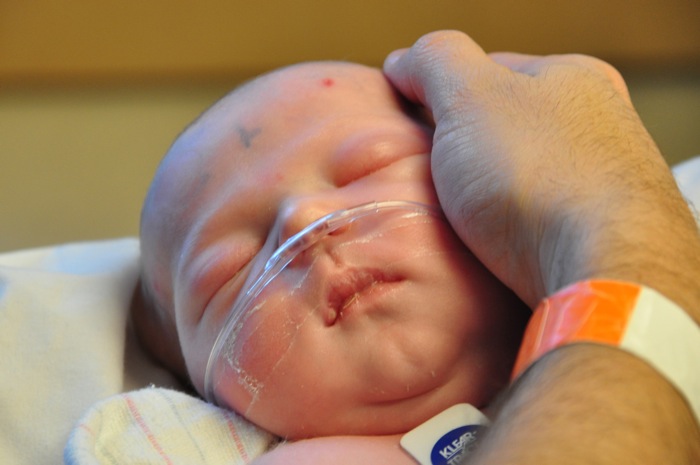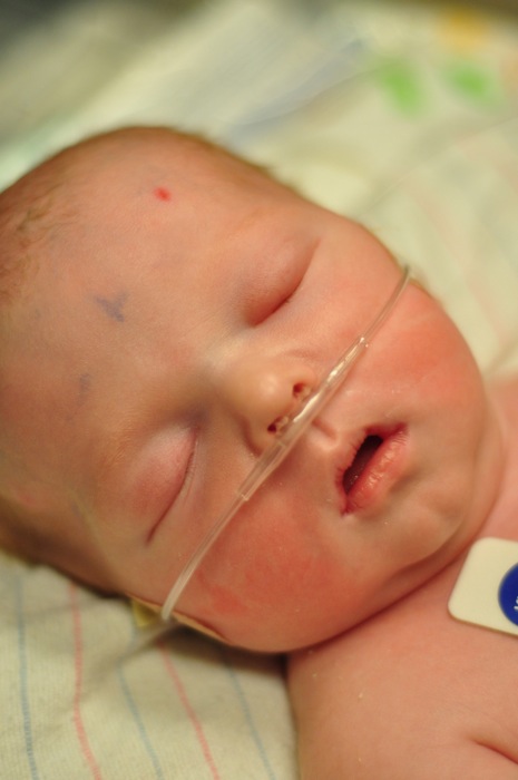 Okay, back to the extubation. The Respiratory Therapist removed the tube, and in a matter of seconds he was all of a sudden without tube or hat for the first time since he was born. They did place him on a little bit of oxygen via a nasal cannula, but that’s the only breathing support that he is getting. He did in fact have to work really hard to figure out how to breathe, and it was really interesting to watch him learn how to work all of the parts to get air without a tube. It was exhausting for us to watch and a little worrisome at times, so we can only imagine how exhausting it was for little Liam. We were fortunate enough to be able to hold him while he worked his way through this process, and you could witness a minute-by-minute improvement in his ability to breathe. His oxygen levels and respiratory rate looked good from the moment that the tube was removed, and he continues into the evening his strong performance.