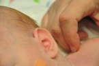Just before 4pm, the staff came in and removed the tube. Liam has had the tube in place since just after he was born and still at Parker hospital, so we knew that there would be a learning curve for him in order to be able to breath on his own. Oh, I totally forgot a really big part of the day….the EEG. We met this morning with the Neurologist and had some discussions on Liam’s seizures and the treatment. They said that they are essentially at a stopping point with the treatment for the seizures. Not stopping the medications, but not able to give much more or a different type. That in conjunction with the sort of seizures that Liam is having, lead us to decide that he didn’t need to be on the EEG anymore. Liam continues to have seizures, but they are non-clinical (meaning that you can’t see them) and they are enough under control to merit removing the monitoring system. Once the EEG was removed, the cleaning began. If someone out there is smart enough to invent an industrial strength cleaning product that is both environmentally and baby friendly, you could make a fortune with hospital contracts. Cleaning off the conductive gel and the marker from the lead placements was a task and challenge in it’s own right. However, the silver lining to the cleaning was that we actually got to clean Liam. It was our first time able to do that for him at all, and it felt really good to do.