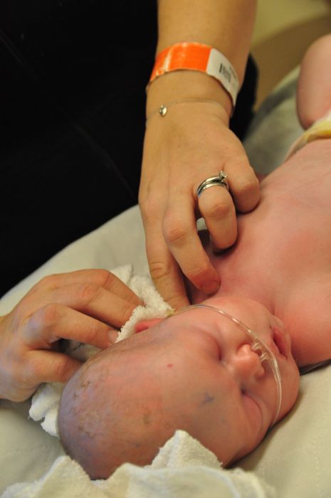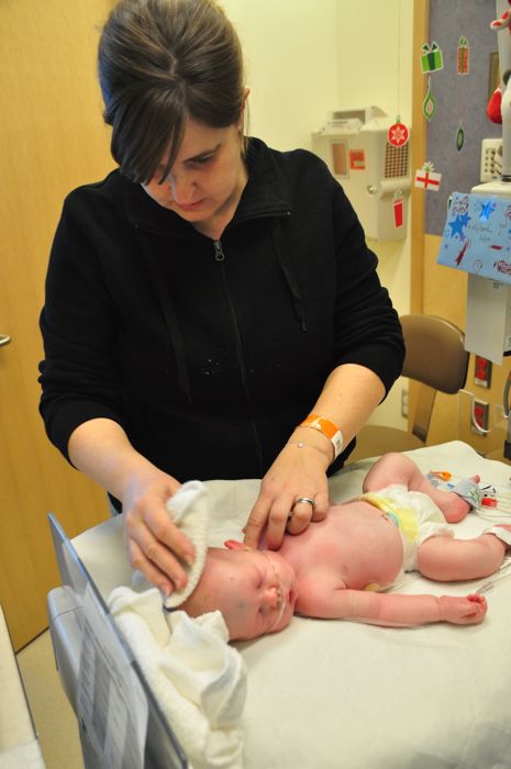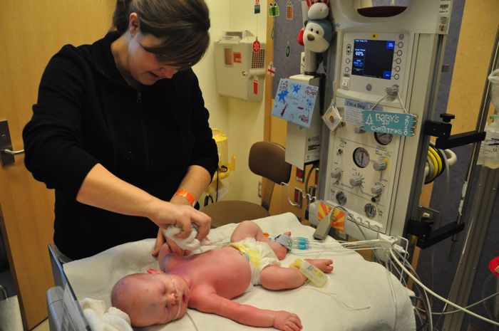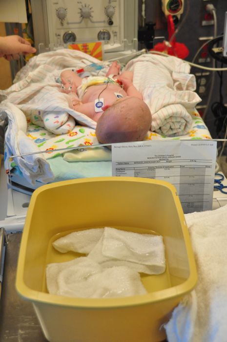 In the afternoon we were able to give Liam his first bath. I suppose that he had something immediately after birth, but I don’t consider that a bath…it’s more of a let’s-make-him-less-slippery sort of thing. Due to all of the lines that he still has (even though they are half of what they were two days ago), he isn’t able to get into a tub of any sort, so it’s a hand-towel bath for now. Because he hasn’t been able to have a bath yet, he was starting to get some dry skin all over, and this wash seemed to double as an exfoliating event. He seemed so much more soft after it was done and it was really great for Ahna and I to be able to do that with him.