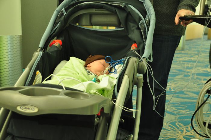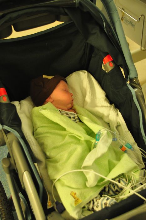 We are really grateful for nurses that push us….and tonight we experienced a definite upside of that encouragement with our first walk with Liam. When we were first asked about taking him out on a walk, we were a hesitant yes…but we also didn’t have a stroller that we could use (we only have one that is a car seat clip in frame, and one that is for kids out of an infant seat). But this didn’t deter our nurse. She called us back on her day off and told us that she would bring in her stroller from home. So, excuses all used up, the stroller came in today with our nurse and we found time to take him out and about just before dinner. It did require bringing along the medication pole which forced a slower pace, but we made a loop around the NICU and a couple loops around the 4th floor. Moments of normal things, even in non-normal settings, are cherished.