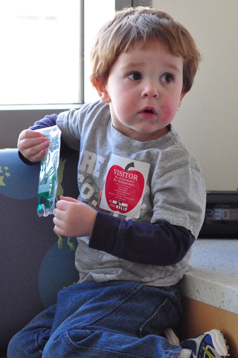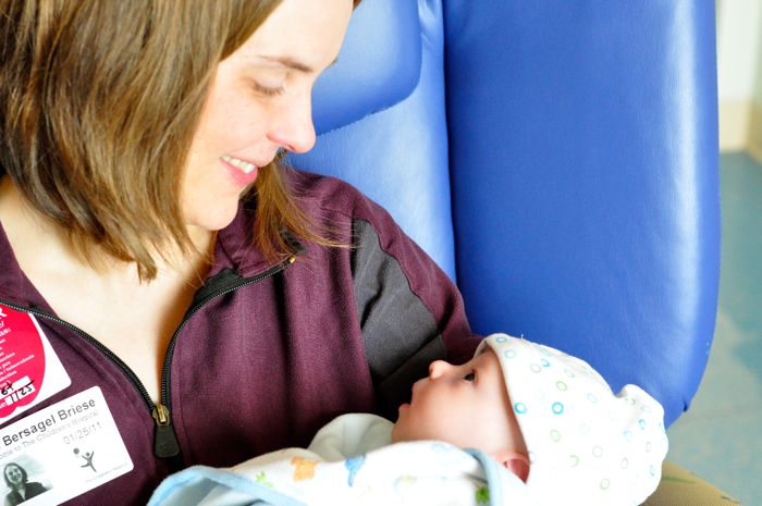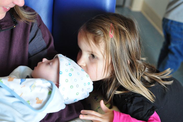 We have been blessed to have Ahna’s parents return, along with one of her sisters and her two daughters. They flew in from chilly Wisconsin on Monday night and will be here for the week with us. They all came up to the hospital yesterday, and Kari and Nora met Liam for the first time. Ezra returned with them…and promptly said hi to Liam on his way to get the iPod to try to watch Toy Story.