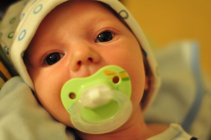 Can you try a small knitted headband over the pacifier and around the back of his head? He really is beautiful.