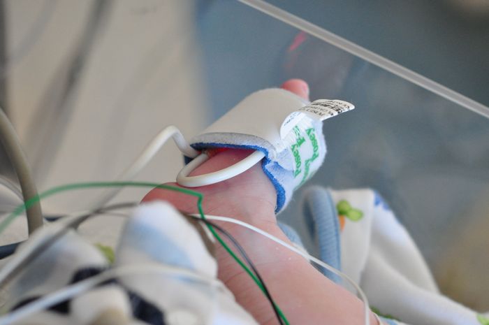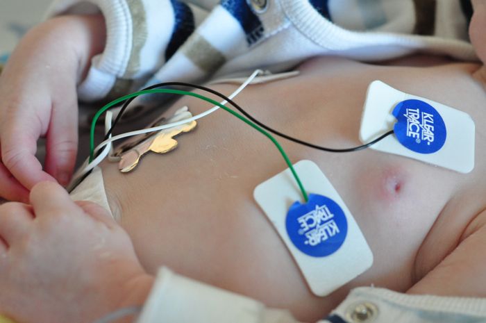 There are five individual points of connection between the monitor and Liam (insert asterisk here, one of them actually goes to the bed): three of those are on his chest, one on his belly, and one on his foot. The three that are on his chest are the ones that are responsible for monitoring his pulse and his respiratory rate and get changed at every bath or whenever they decide to stick to his clothing instead of his body. Throughout out stay here, we have become educated in a lot of things, one of which has been how to place those leads on Liam, and how to best remove them with as little chance of pain as possible – although there is probably no physical way of doing that completely.