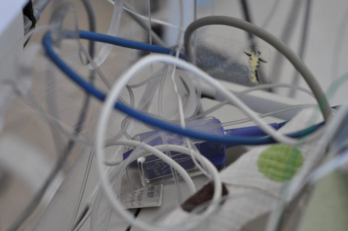 The lead on his belly – in the photo as a golden bear – is actually a temperature sensor that is hooked into the bed. The computer then uses that information to control the amount of heat that the warmer puts out to keep Liam at a certain temperature: 36.5 celsius. For some reason, this lead and wire are the most difficult to deal with and like you computer cables at home, will always become knotted and tangled no matter how perfectly you placed it last time. I think that it’s because it’s got a heavy connection point on the end and a small flimsy wire that it will just knot itself with no warning and with no easy ability to undo it.