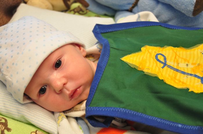 We have been treated to several handmade gifts for Liam since he has been here. We posted about a blanket, a painting,  and a hat (on second thought, maybe we haven’t mentioned the hat yet, so I will work on a photo of that….or if it has been mentioned, I can’t find the post) that he was previously given, and this time we are posting about two other things that people have graciously given to him. So the first item is a cape…yup a cape! One of our friends gave it to him because “every boy needs a cape.” How right she is. It was handmade by a friend of our friend at a place called Happily Home Sewn, and features a big ‘L’ on top of an Aspen leaf/tree. It’s perfect.