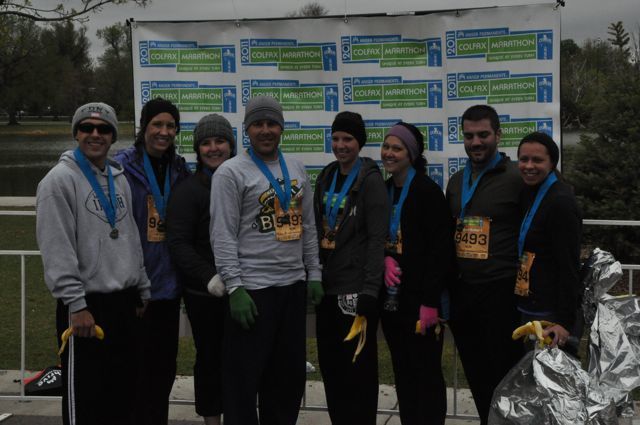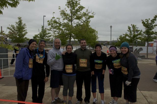 This past Sunday morning was the race, and Tracy and Olivia kicked it off nice and early in the cold and mist. Ahna and I followed with leg 2, a 10K run through downtown Denver and through several miles of cold and rain. We passed off to Jay and Karen who ran a mostly uphill leg out towards Edgewater, and they met up with Tallie and Melissa who came hauling back to Invesco Field. Mark and Kendra got the joy of finishing the race back into City Park, and we all met with them just before the finish line to run across together.