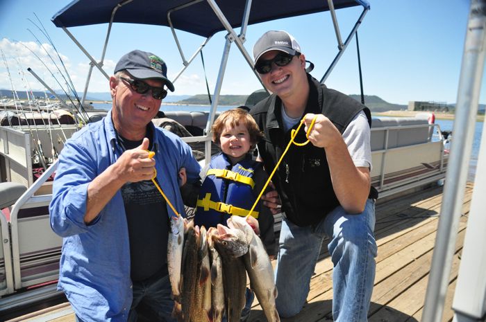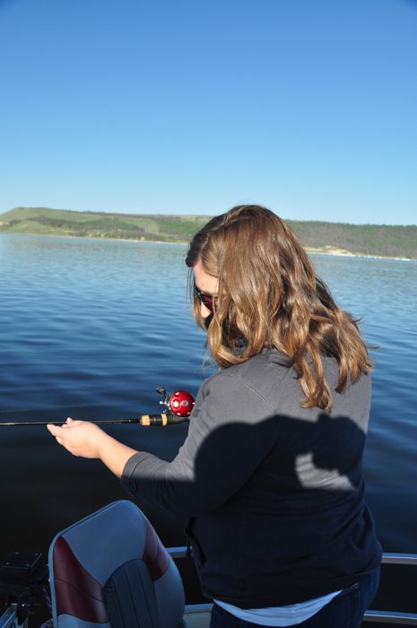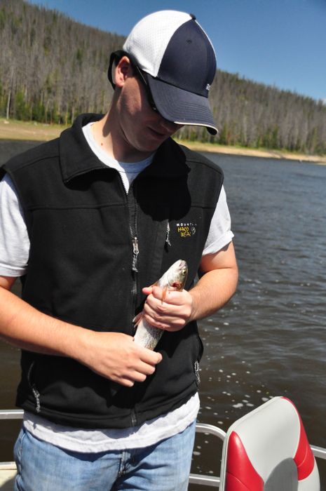 The next morning, we got up early and headed out for a few hours fishing. Close family member Hunter came up to spend a couple of days with us, and he got there just in time to see what Colorado fishing is all about. Despite a cold morning on the lake (50s), it didn’t take long to start catching fish; and it wasn’t hard to keep catching them. During our four hours on the lake, we were able to catch somewhere in the neighborhood of 15 fish, including at least one of every kind of fish in Lake Granby….the Granby Grand Slam as the guide called it. In that mix were Ahna’s first ever catch, Ezra loving to help reel but being scared of the flopping fish in the boat, and Hunter and Dad going back and forth on which fish to keep and which to get rid of…..(the story here revolves around being able to tell the difference between a brown trout and a rainbow). We ended up keeping a handful of fish, and bringing them back to the cabin for some deliciously fresh dinner that night.