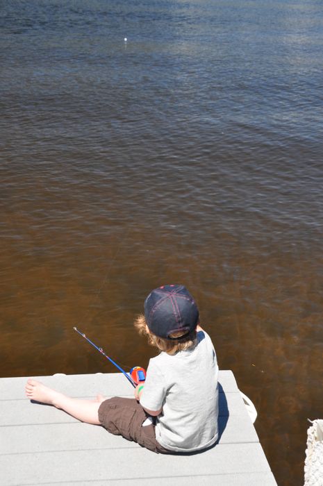 One of the boating excursions was in the company of a guide and with the expressed intent of catching some fish. But in order to prepare for this trip, Ezra went out with Saba the afternoon before, and spent some time on the dock learning the basics of fishing…namely what half a worm looks like, how to cast a rod while worrying about loosing an eye, the art of staring at a bobber, and patience. Ezra did take the opportunity to test Saba’s reflex speed by dropping the rod in the water once…and Saba passed the test with flying colors before it became an exploratory mission.