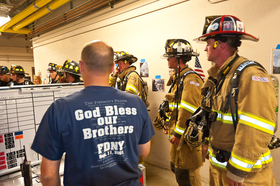 Each year – seven of them now – there seems to be this massive workload of event planning and organizing that takes place in the immediate run-up to the climb. A pile of logistics, information, and organization all culminate in the hours prior to the climb actually happening. There are times in those days that it gets to the point that I actually look forward to the time period that comes just after the climb is done where there is nothing to do but wait to start it all over again. But then the morning of the 11th comes around, and the firefighters filter into the loading dock, and the tribute begins….and it’s all immediately worth while. I have the unique opportunity to help organize the climb with a few other folks, including Dave, Scott, Sean, and Mark; and it has to be one of the most rewarding things that happen each year.