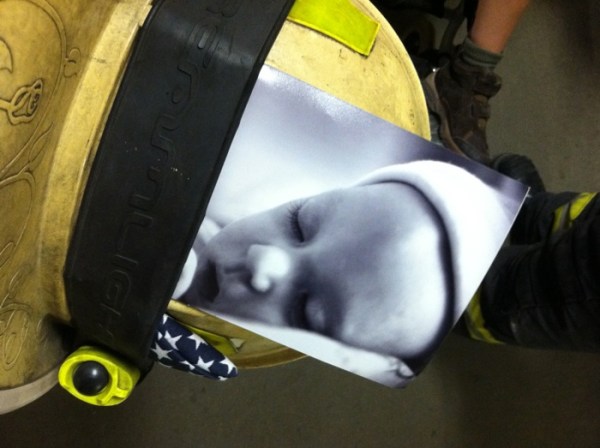 [UPDATE] For some reason, I forgot to include this – even the best forget things sometimes. A great friend, fellow organizer, and District Chief up in Denver not only climbed for his late FDNY friend, but also with Liam. He asked for a photo, put it in his helmet, and carried Liam the full 110 stories. I actually got choked up at the thought, and again (this seems to be happening on a extremely frequent basis) was humbled by friendship and love. Photo is below.
