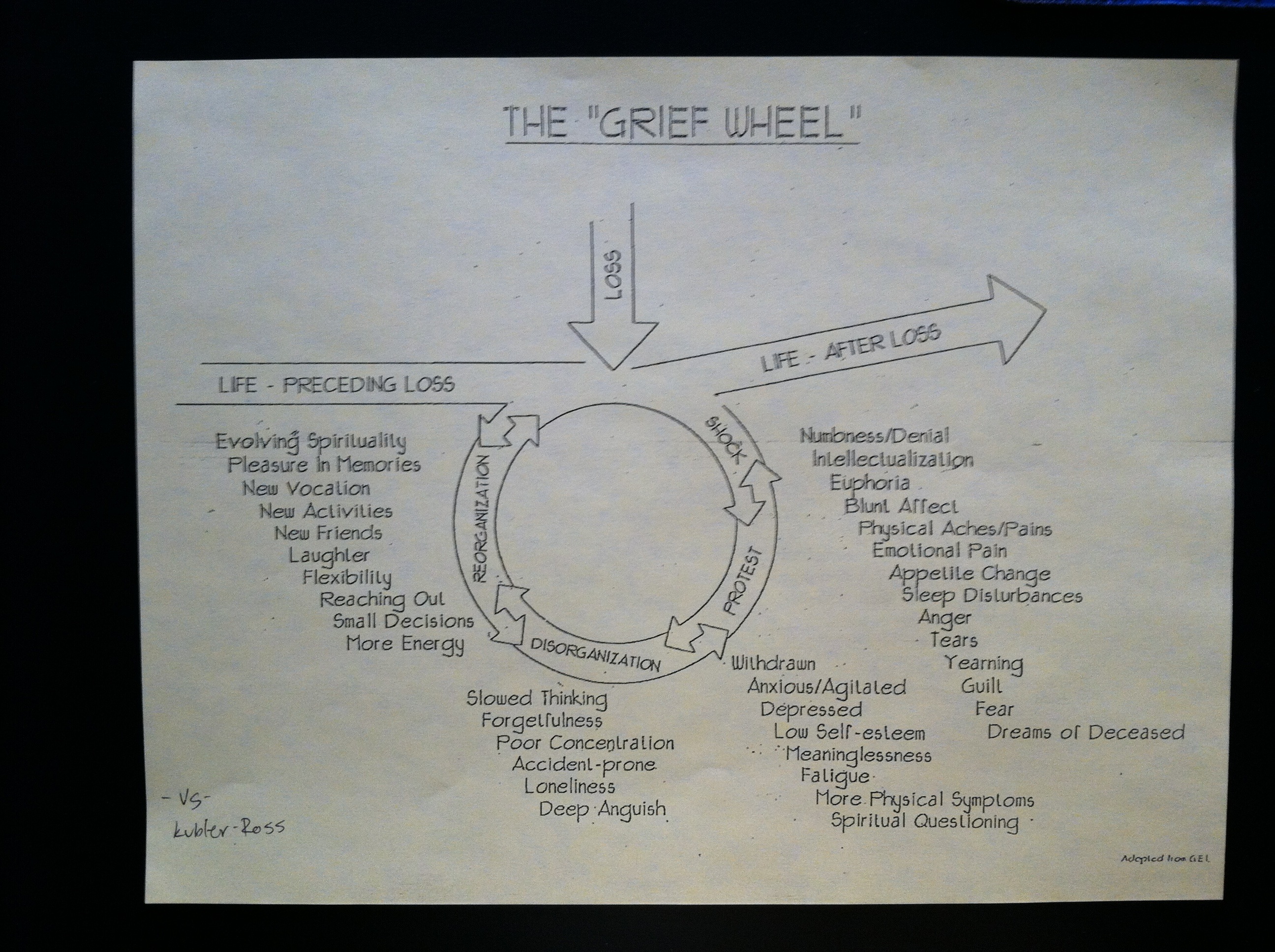 The week three meeting of the Parent’s Group centered on learning about the grief process. It was the first meeting where we actually started to move in a direction of understanding, instead of the necessary but difficult introductions. Now, let it be known that the meetings are not a lecture or educational platform. Each one has an agenda and direction, but the conversation often moves in different directions depending on the needs of the group on any particular night. And just because the first two weeks are behind us, it doesn’t mean that so are the emotionally challenging moments – for those happen all throughout each and every meeting.