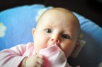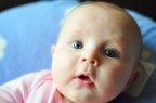 Very much like Ezra, Elia has an absolute unrelenting affinity for facing out, sitting up, and seeing what is going on in the world around. Occasionally, this disturbs her (like in a busy restaurant) but for the most part it’s her position of choice. She hates – and I mean hates – being on her belly (not even to sleep on us), so any attempt to even start the roll-over process is going to prove to be a long way away. However, she has channeled the energy normally reserved for the rolling over activities into strengthening her neck for her upright adventures. While we still place our hands in a position to support her head should she flop, the actual needs to catch her are becoming quite infrequent. She has taken ownership of the center of the couch (where if we are not careful, she will zoom in on the TV across the room), and has started to earn herself some Bumbo time. She seems to really enjoy the accomplishment of sitting by herself – for five minutes or so – before telling us that she is in need of some human contact again.