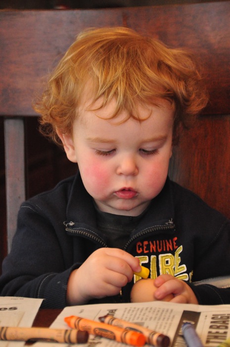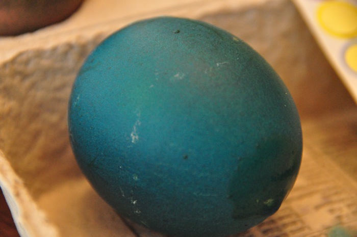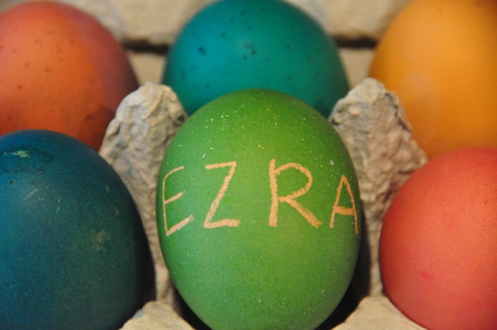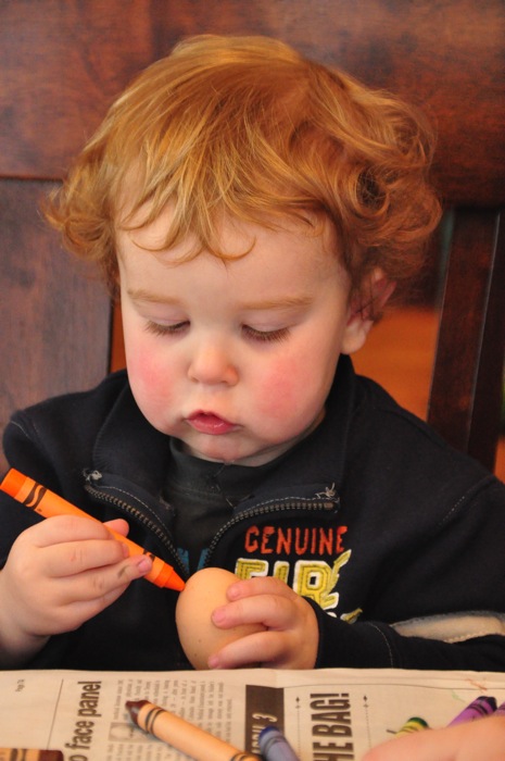 Don’t think that there is much explanation about these photos needed. Ahna and I did most of the coloring using the liquids since Ezra’s favorite thing when sitting at the table is to pull everything and dump it on the floor. He participated by designing and coloring his own egg, and upped us by adding some unique design features in the way of a few stickers.