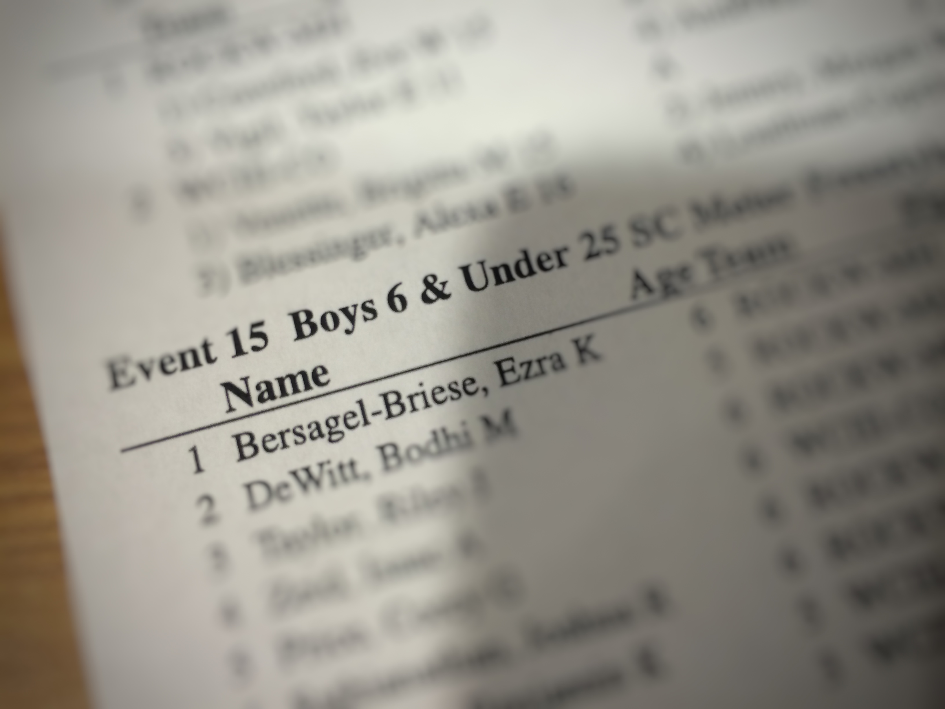 Being at the pool at 545am, watching the set up and warm up, hearing the starter, and listening to the races brought back a lot of good memories. But being part of the larger experience, and seeing it from the seat of a non-participant was a lot more fun than I initially thought it would be. Of course, when Ezra lined up in the heating area, then moved to the starting blocks, then dove (ish) in when the starters “beep!” sounded, then raced as hard as he could to the other end of the long course pool, then finished second in his heat during his first ever race, then got out of the pool with an exhausted smile…well, that made Ahna and I pretty damn proud. Then he did it all over again about an hour later in the backstroke race with a less good finish position, but with all the same effort and joy.