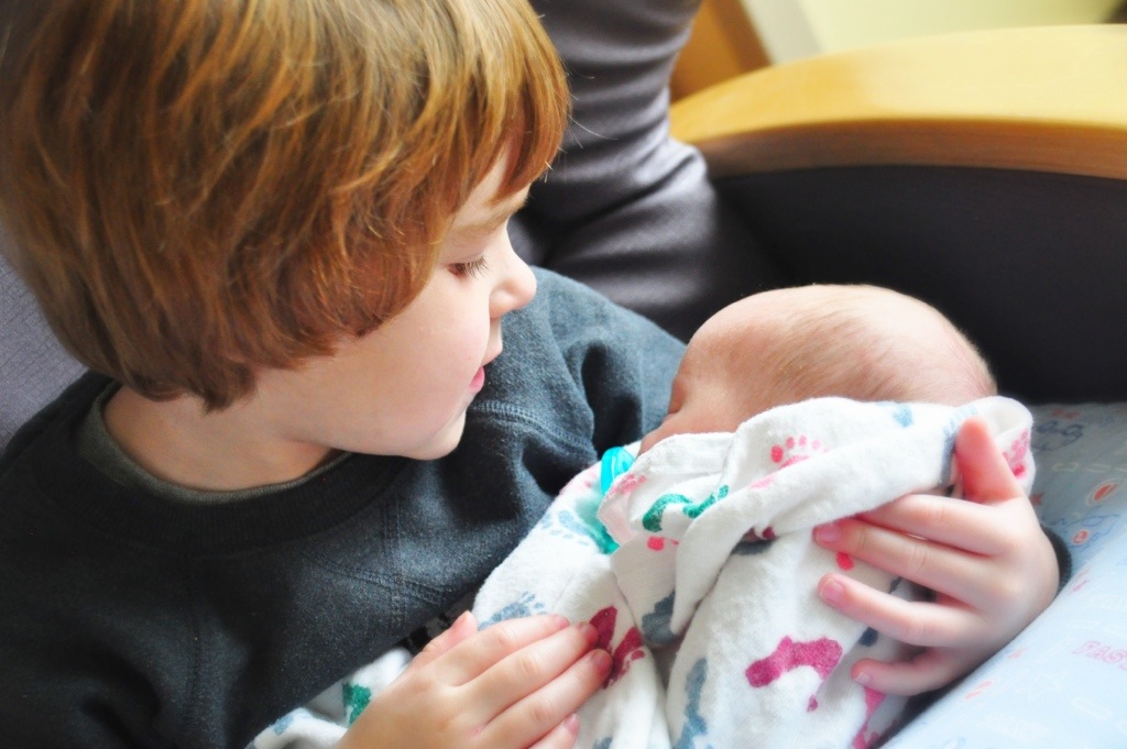 Last night, when he saw her for the first time, he exclaimed “she is so beautiful!” Remarks similar to that one filled his visit last night, and while the newness wore off a shade (in the way it does for four year olds) by the time he came this morning, his obvious and apparent love had only begun to grow…like walking around and telling anyone that would listen about his sister.
